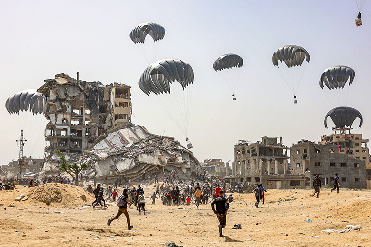 Des Palestiniens accourent pour récupérer des colis d'aide humanitaire largués au nord de la bande de Gaza le 23 avril 2024.
